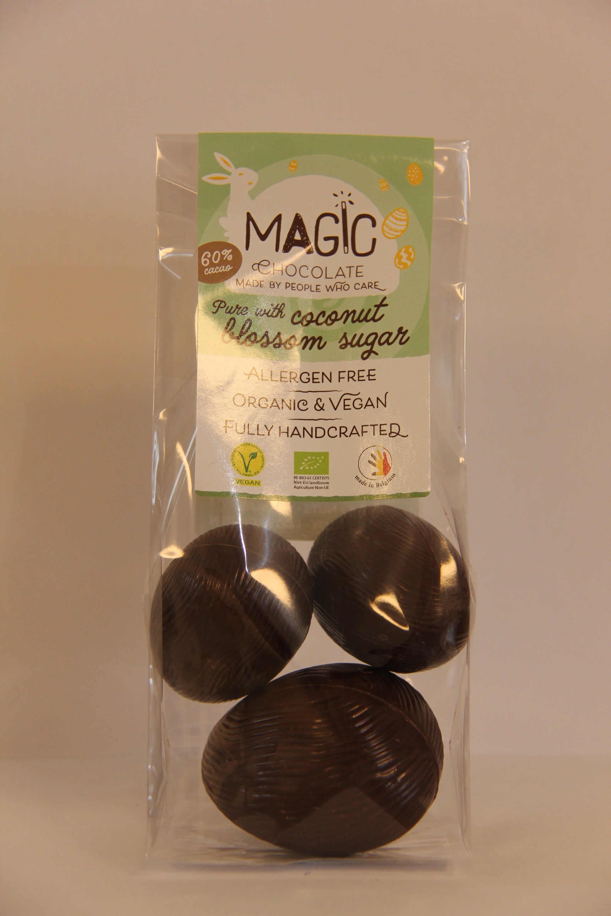 Cachés quelque part dans une forêt enchantée, trois mystérieux œufs de Pâques creux brillaient d'une saveur enchanteresse appelée « Hocus Pocus 60% ». Avec nos œufs, vous avez 85 grammes de pur plaisir, de petits trésors magiques à découvrir.